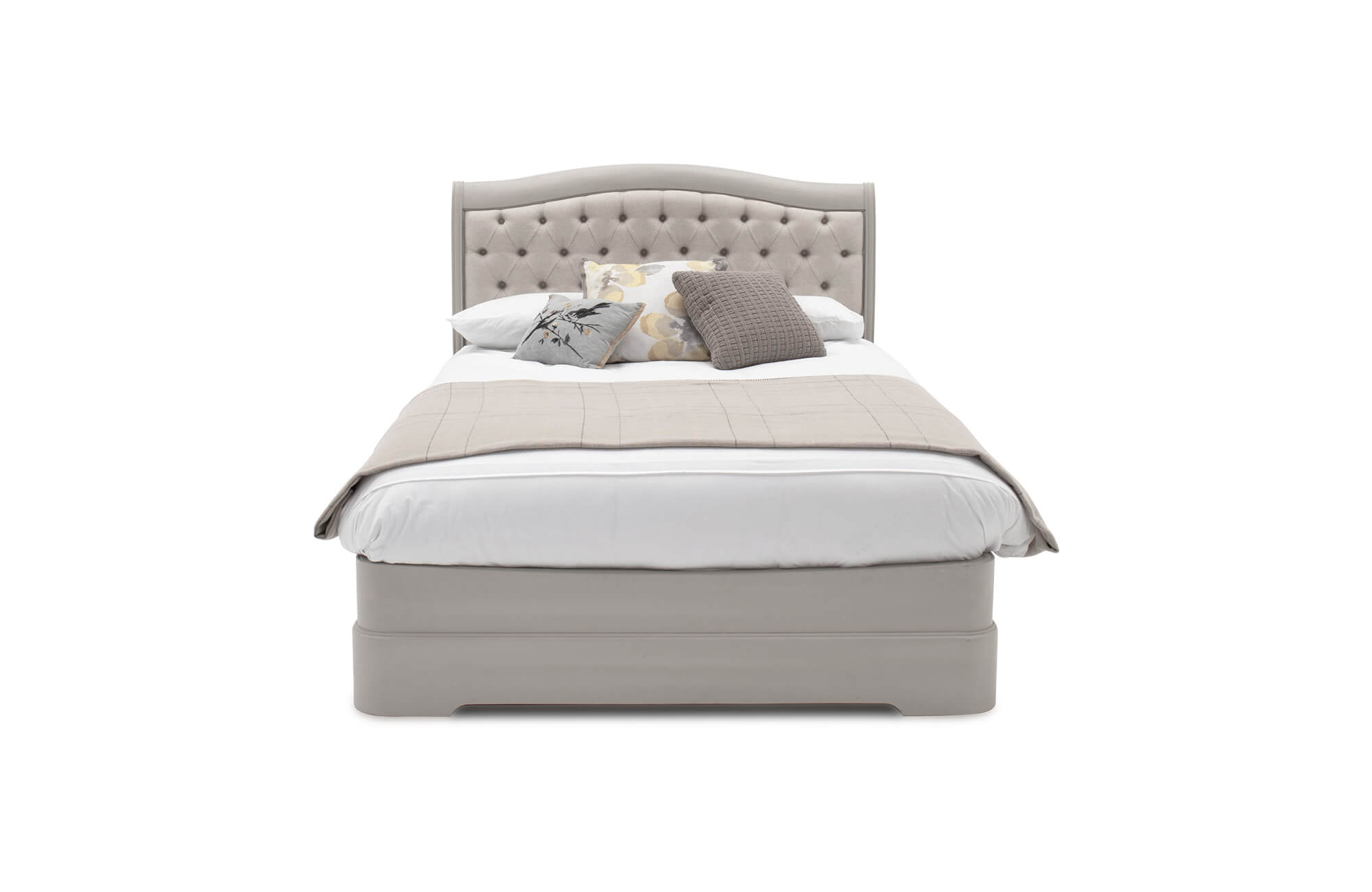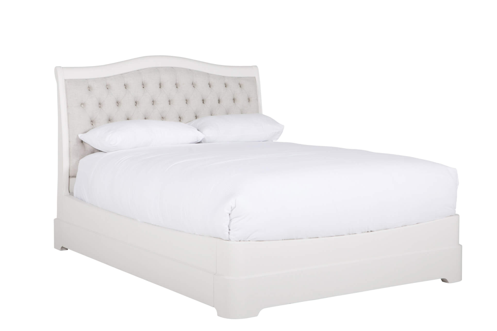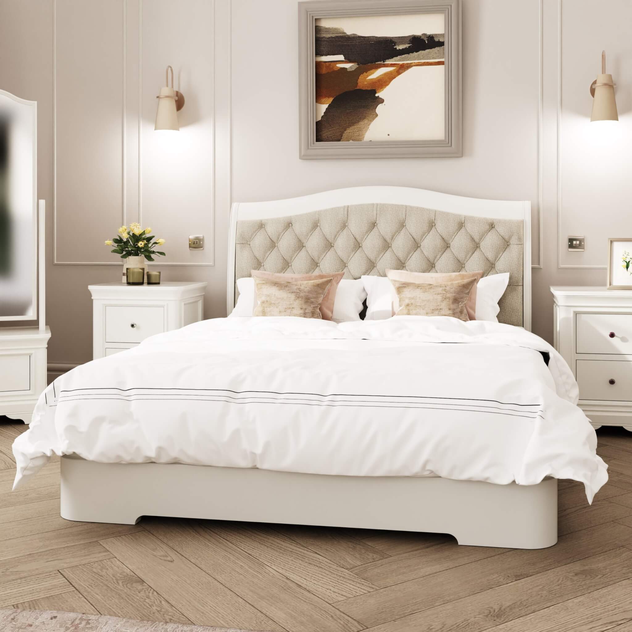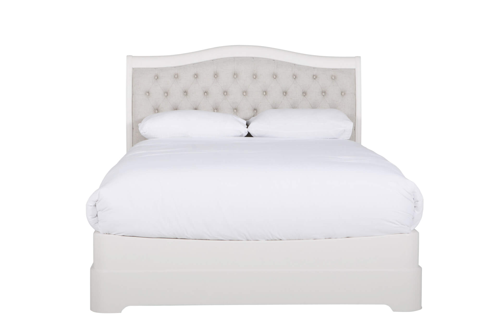 Every component of the Elegance bedstead is designed to emphasise the natural beauty of the wood. Embodying Sophistication and style in painted bone white or Taupe. With its deep button linen style fabric headboard and elegant curves.