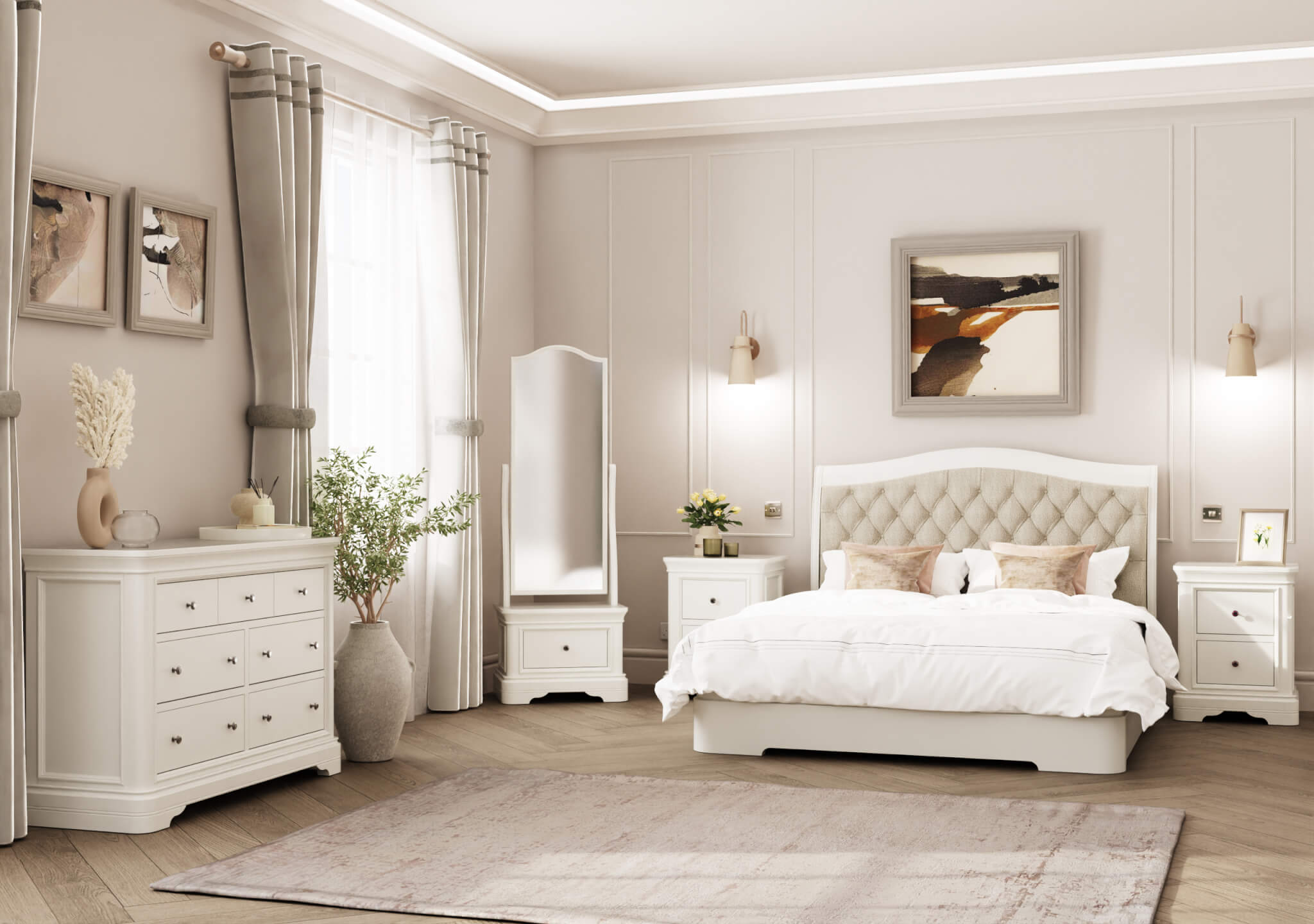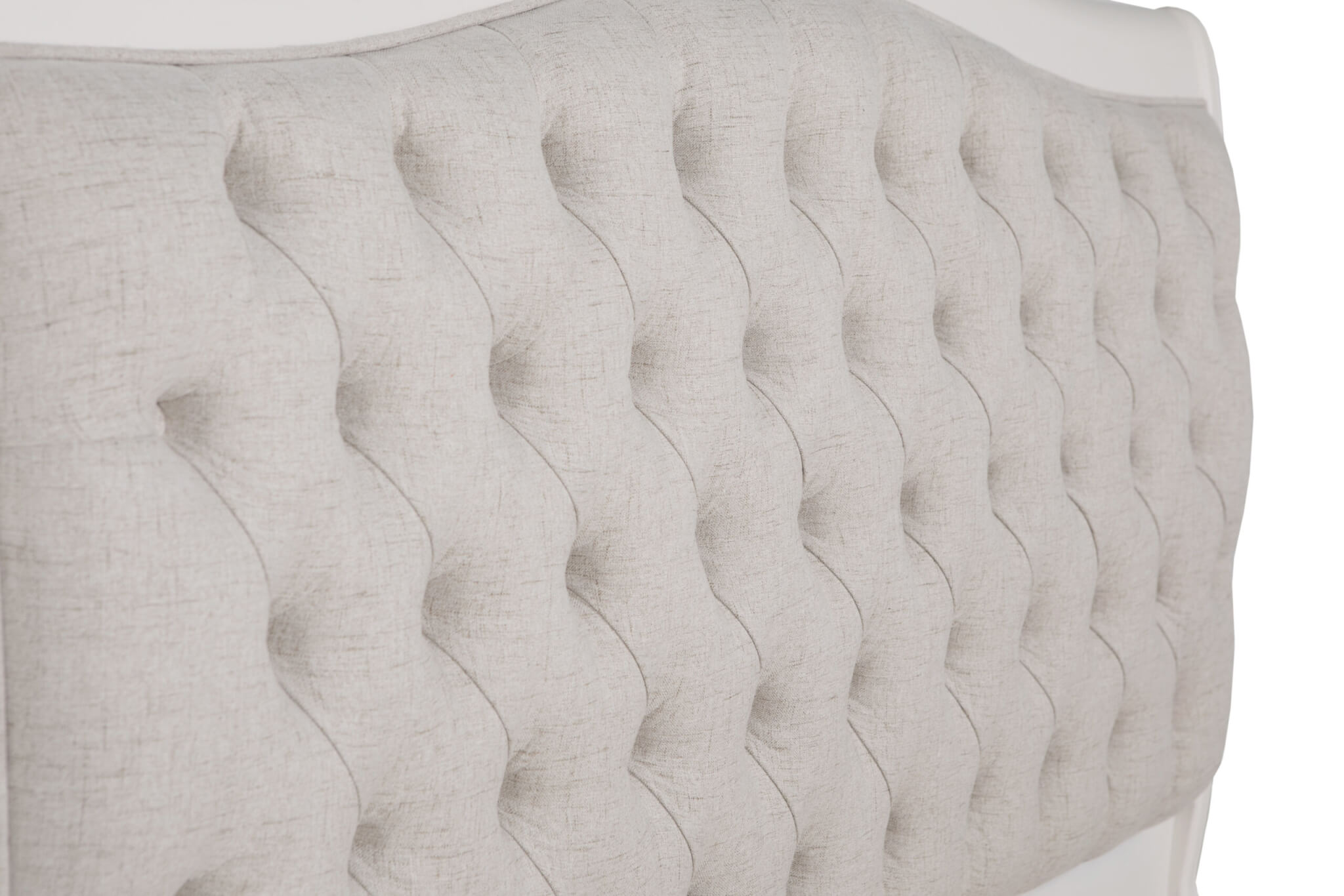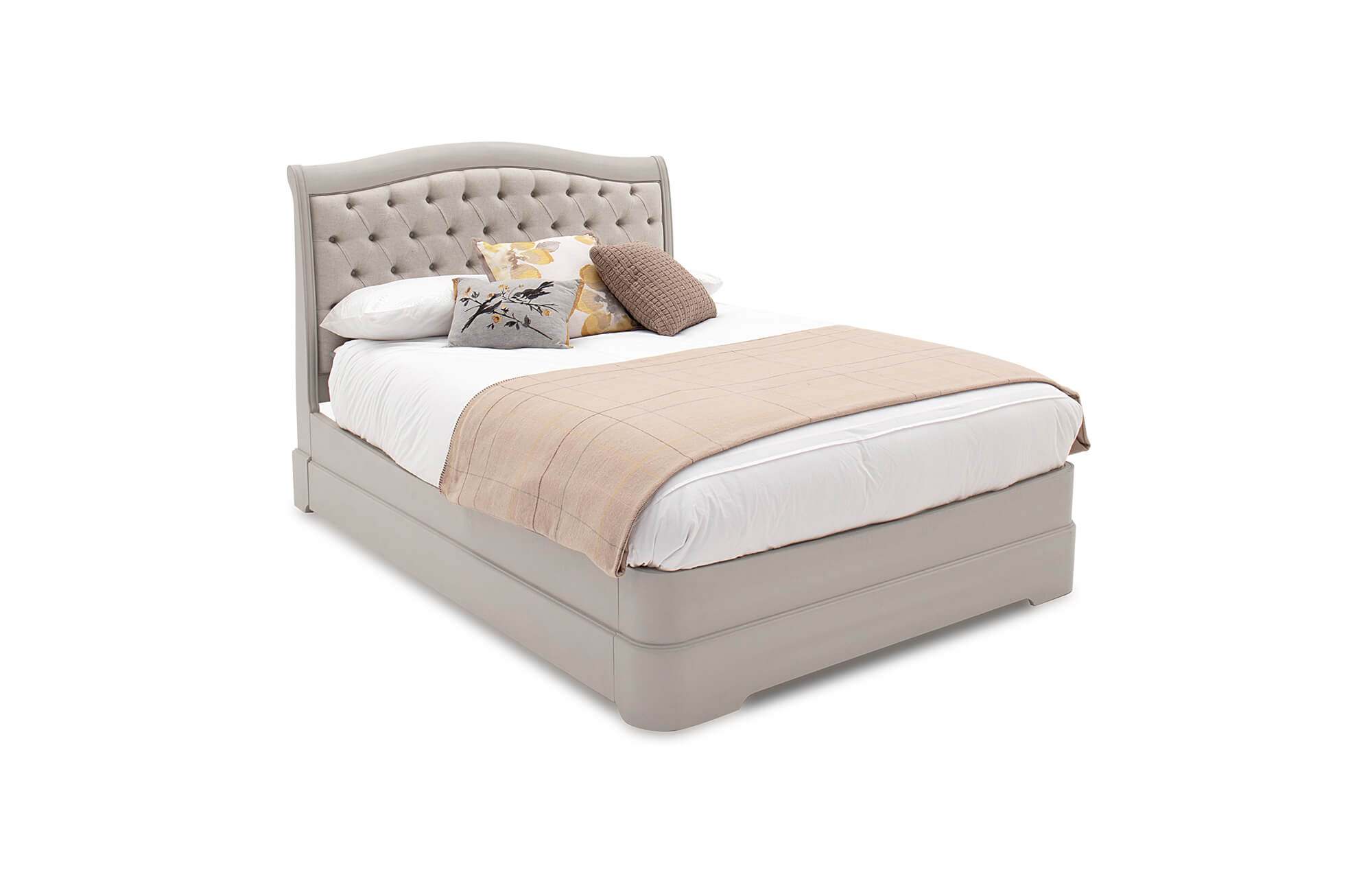 Every component of the Elegance bedstead is designed to emphasise the natural beauty of the wood. Embodying Sophistication and style in painted bone white or Taupe. With its deep button linen style fabric headboard and elegant curves.