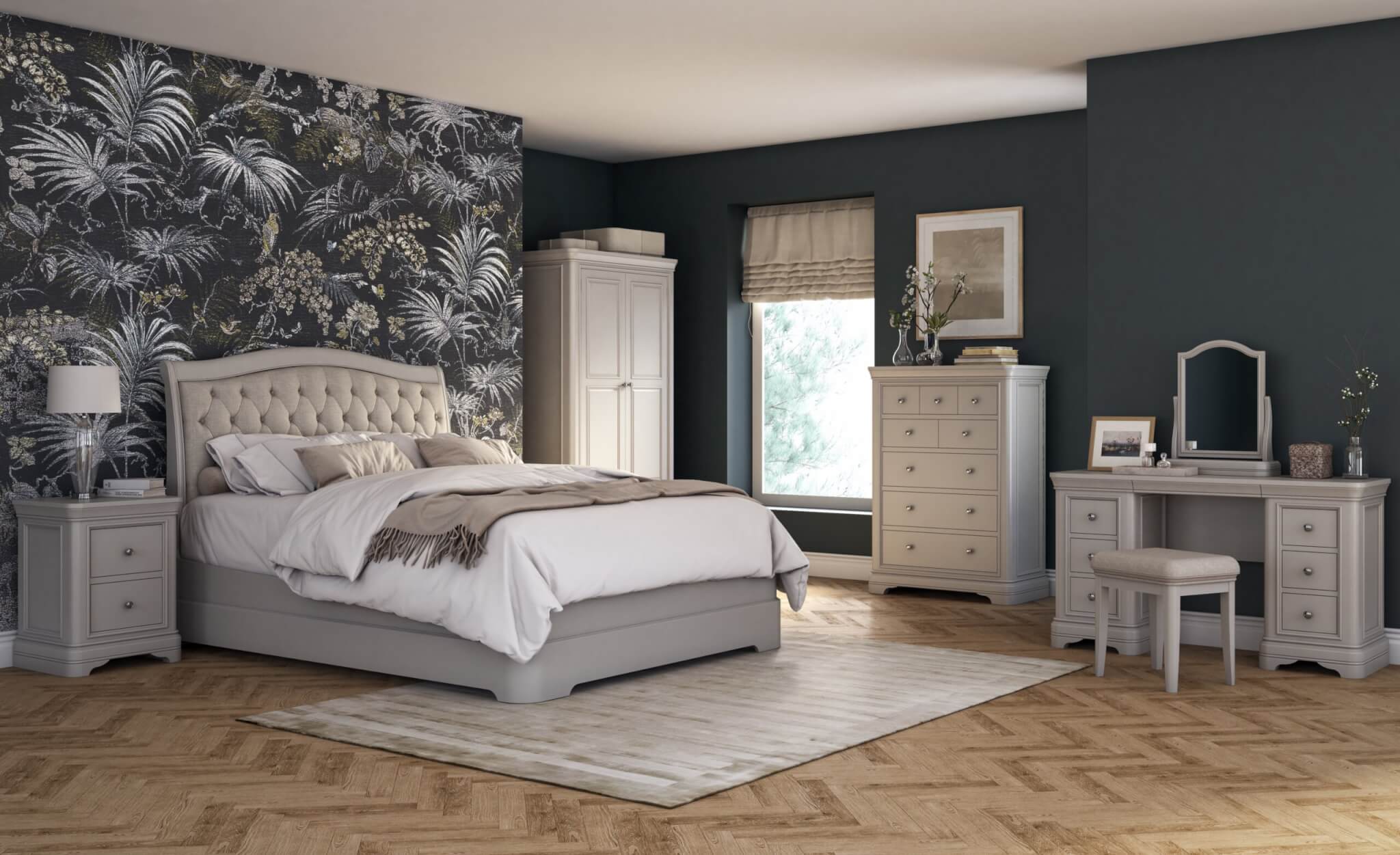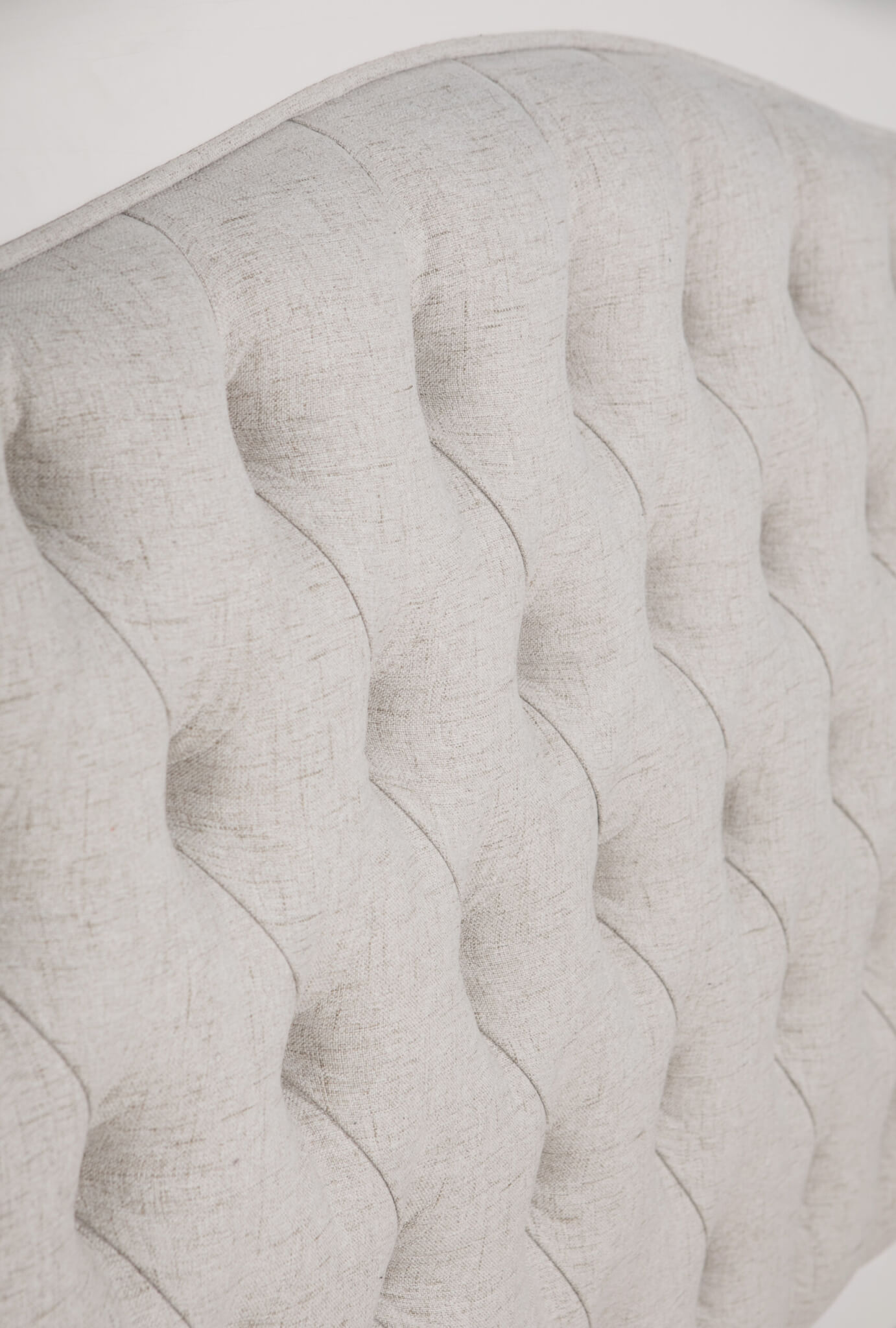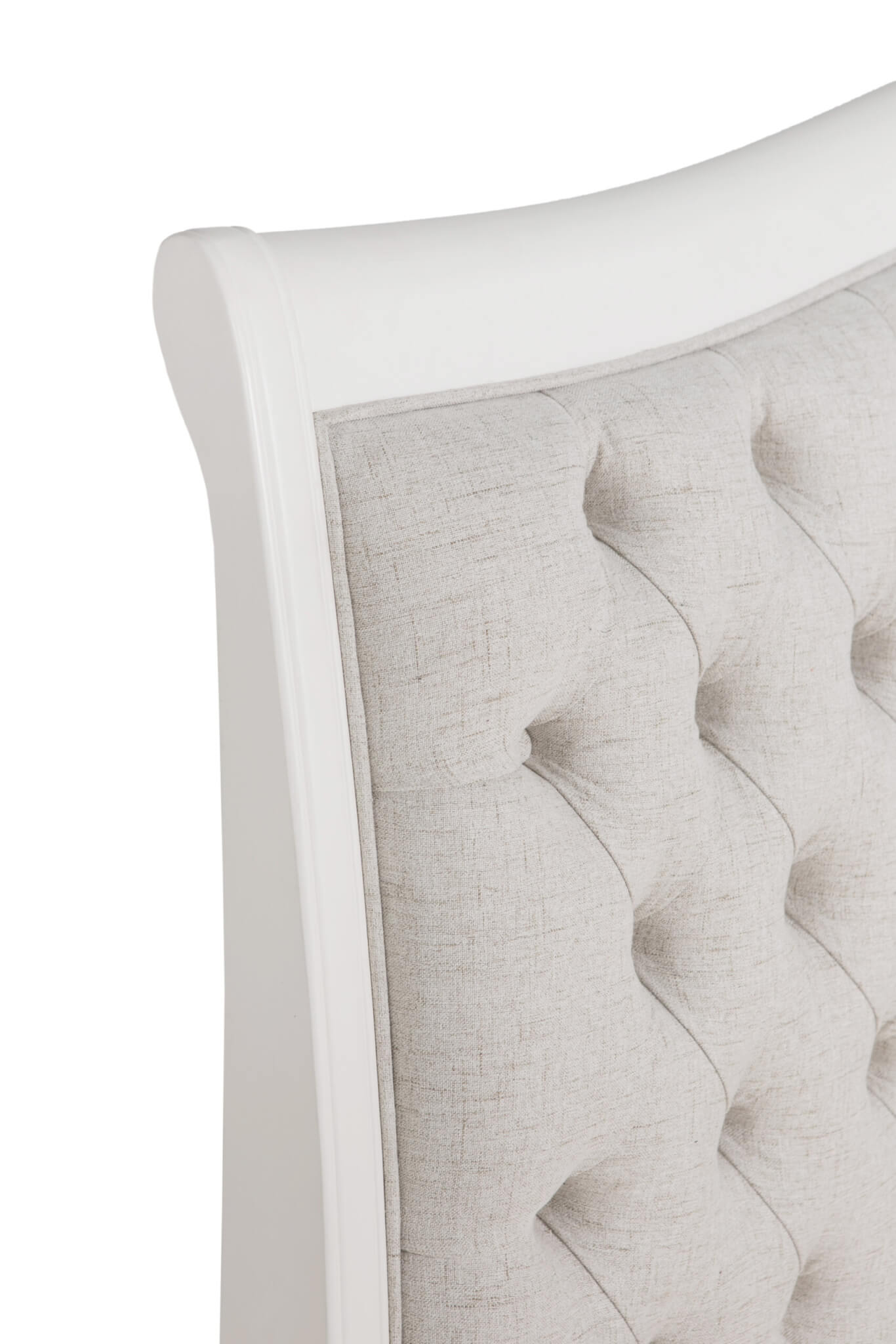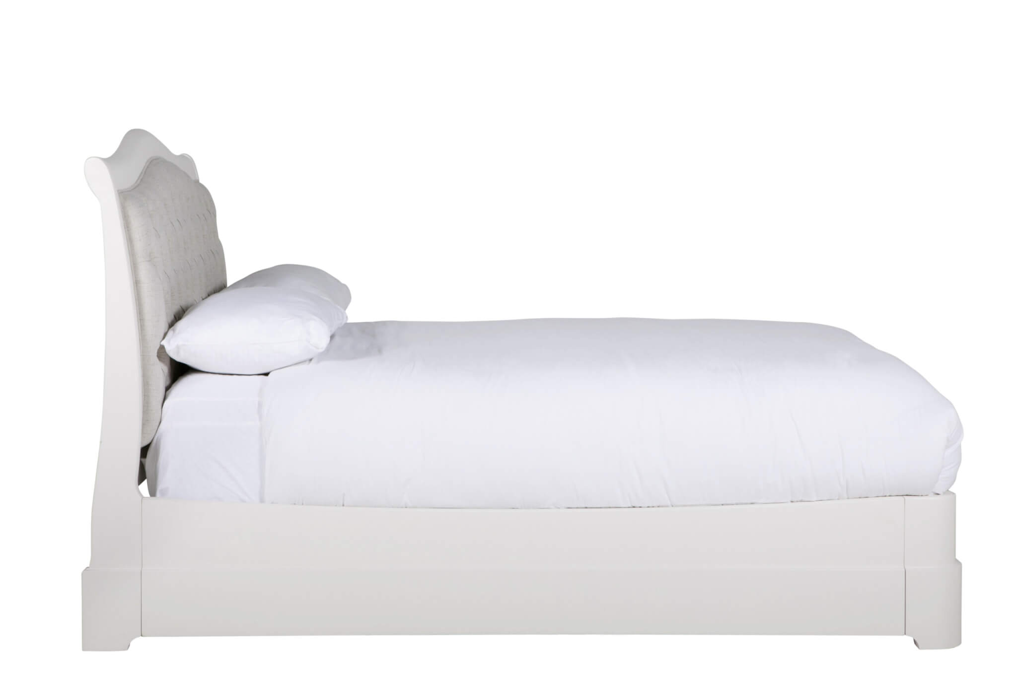 Every component of the Elegance bedstead is designed to emphasise the natural beauty of the wood. Embodying Sophistication and style in painted bone white or Taupe. With its deep button linen style fabric headboard and elegant curves.