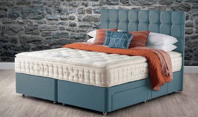 The Pillow Top Cotswold from Hypnos is a Luxurious, responsibly sourced cotton sleep surface that is safe and naturally fire-resistant. ReActivePro™ 6-turn pocket spring system and Triple Edge Protection™. Hand tailored with two rows of genuine hand side-stitching. A plush pillow top with sustainable Breathable fibres, Solotex™, a fleece of British wool and eOlus™ recycled fibres. Atop a deep layer of Himalayan allo, kapok and cotton to provide sumptuous support. A Single sided with a pillow top, so there’s no need to turn – just rotate regularly. Mattress height 29cm. The Pillow Top Cotswold comes with a 10 year Guarantee. The Divan base is available in 50 colours and matching headboards are also available in a large choice of designs and colours. Other headboards are available, please see our headboard page.