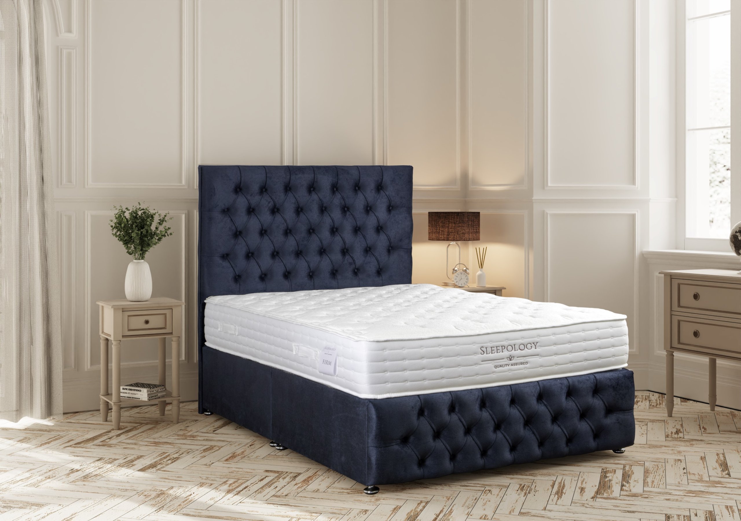 The Sleepology comes as an Extra Firm Mattress. It is 9 inches of firm support foam, Luxury soft fabric top, handles and quilted boarder.The Sleepology mattress comes with a 5 year warranty. Single sided mattress – Regularly rotating the mattress will even the wear of the fillings and extend the overall lifespan.The Divan base is available in a large choice of colours and matching headboards are also available in a large choice of designs and colours. Other headboards are available, please see our headboard page. This Divan Set is available with all tailoring options.