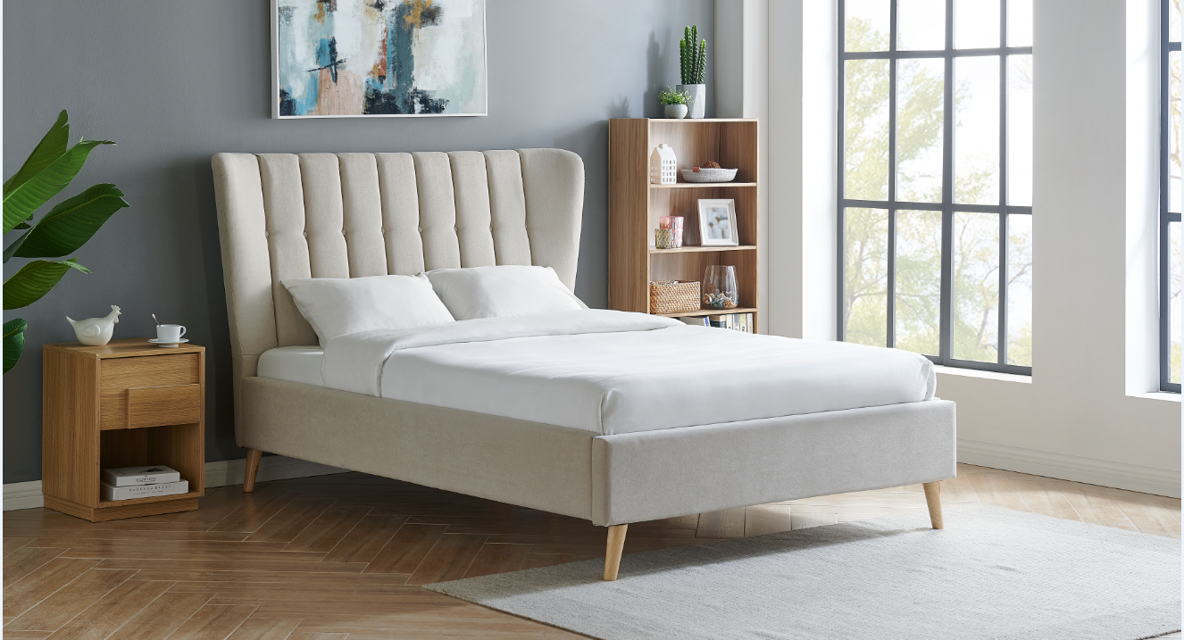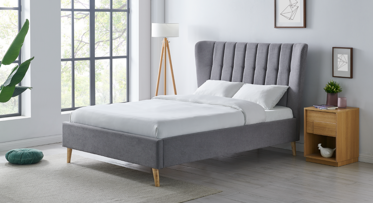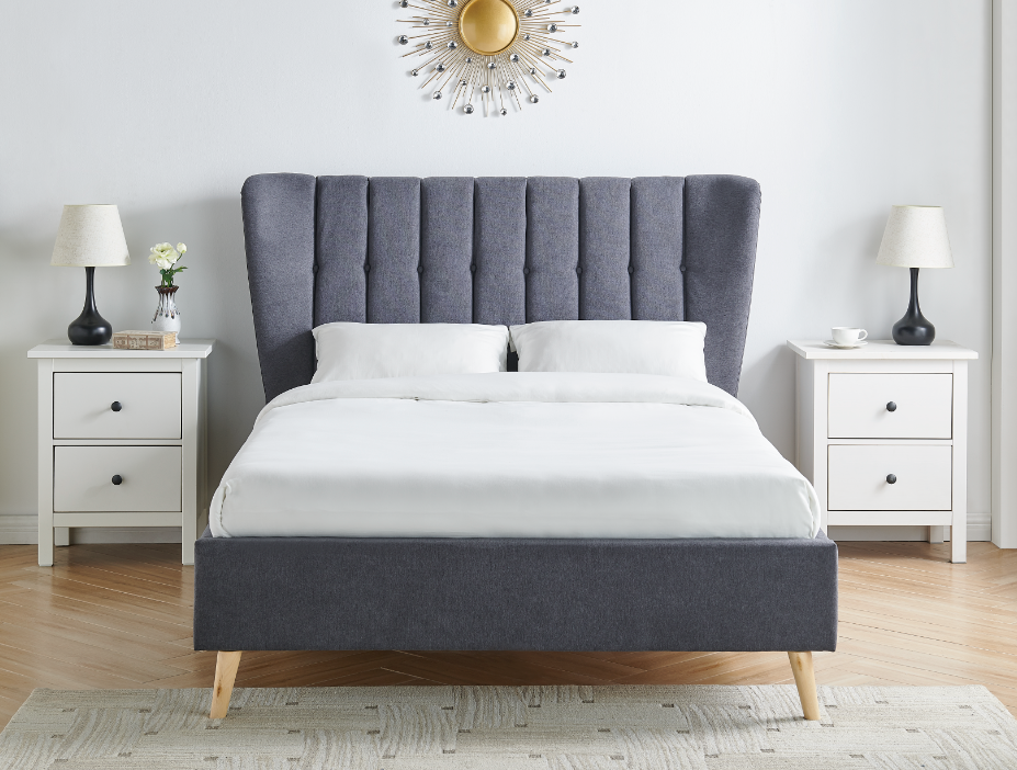 The Tania is a Modern Style Bedstead upholstered in a Stunning Light Grey , Dark Grey or Natural Fabric available in Double and Kingsize.